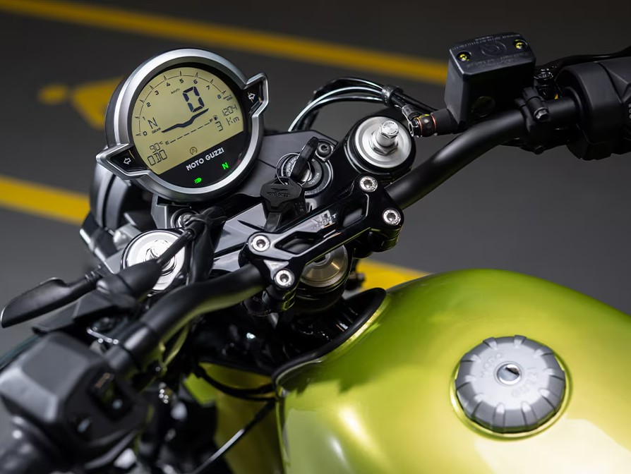The Moto Guzzi V7 Sport packs an instant punch with its dynamic lines. The handlebar-mounted mirrors and black seat with visible stitching emphasise its sporty elegance. The six-spoke lightweight alloy wheels add a distinctive design touch, as do the aluminium inserts on the side panels and the aluminium headlight mounts. Every detail is meticulously engineered, including the handlebar riser clamp, which features a laser-engraved V7 Sport logo .